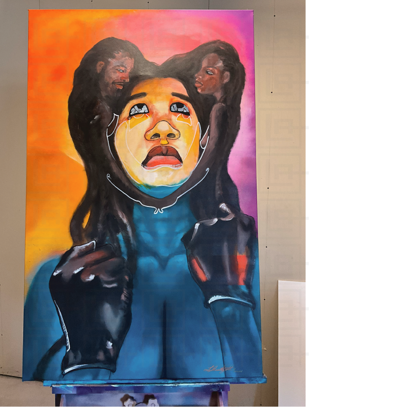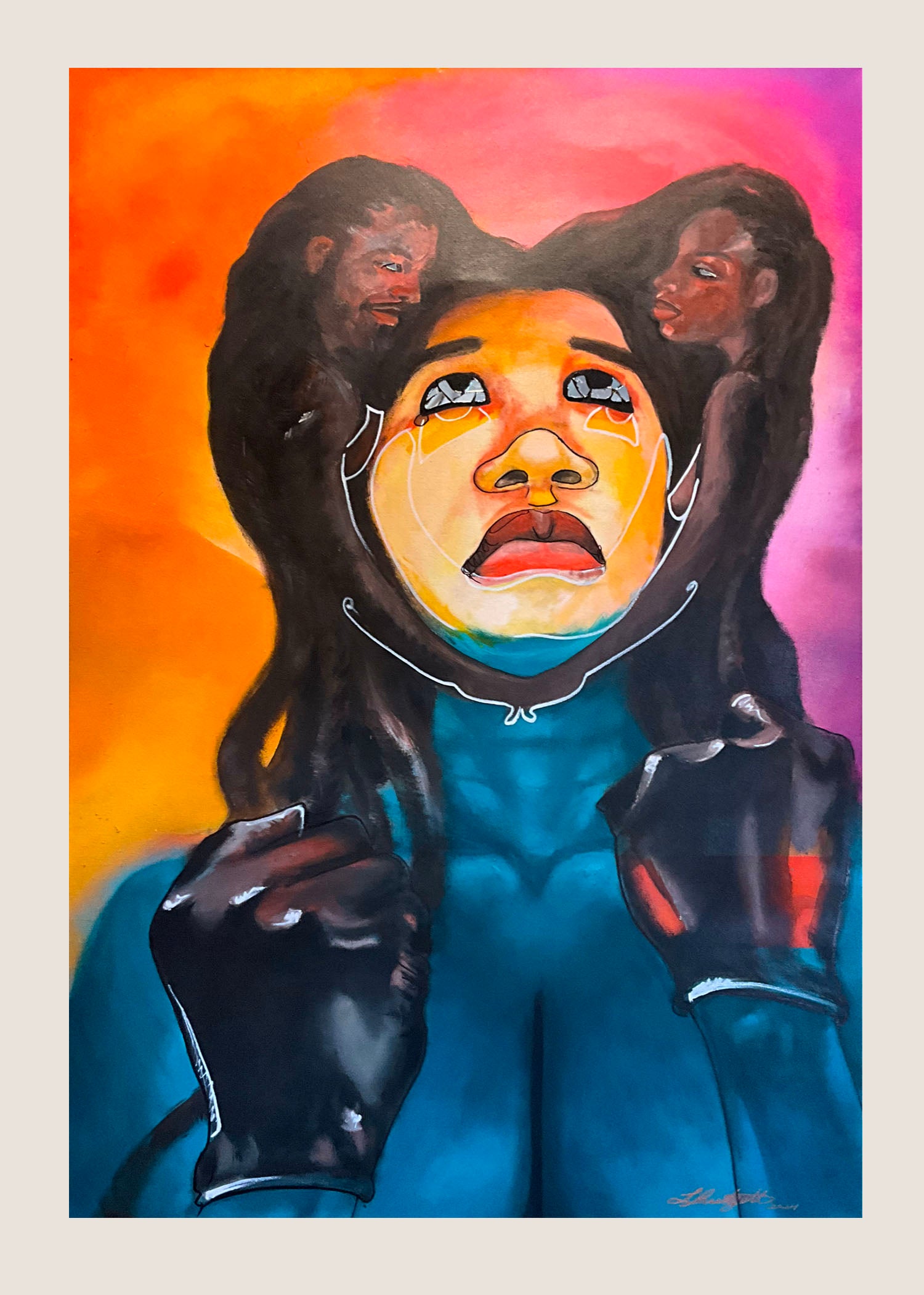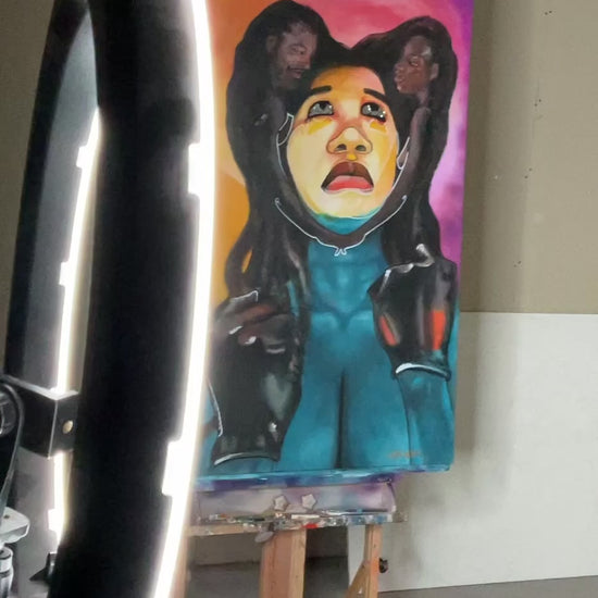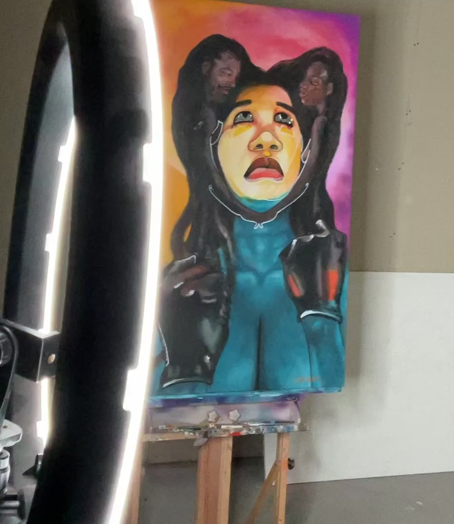 The painting portrays a woman who continues to believe in love and healthy relationships despite past heartbreak. Surrounded by vibrant orange, pink and aqua blue, she embodies hope, vulnerability, and emotional resilience. The mirrored eyes reflect both her inner strength and the viewer’s own journey of love and healing.