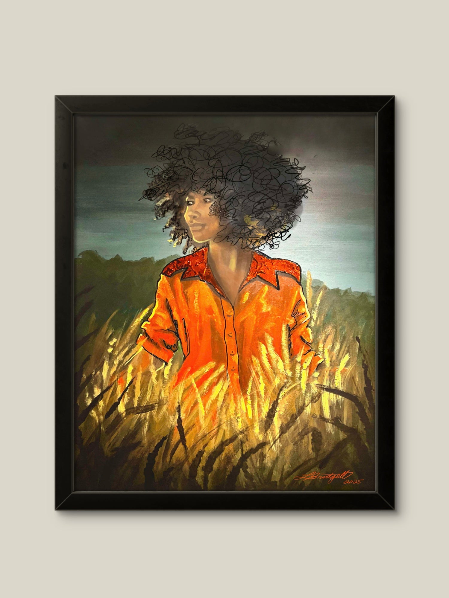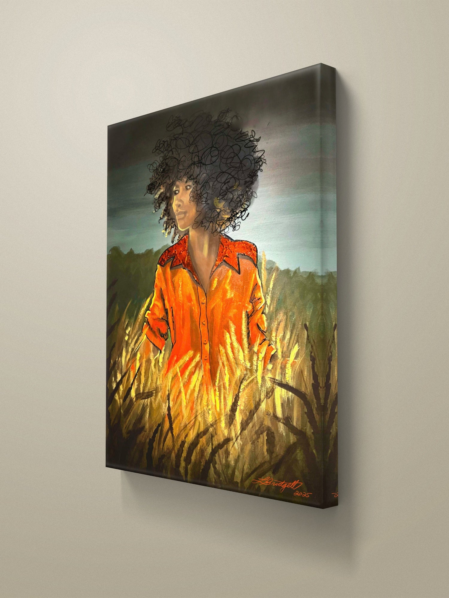 This stretched canvas brings a warm, soulful moment into your space — a painted figure in a sunset-lit wheat field, captured with rich, painterly strokes and a glowing orange shirt that draws the eye. The semi-gloss polyester surface holds vivid color and contrast, while the hand-stretched fabric over a pinewood frame gives the piece depth and presence on the wall. It hangs ready with included hardware, and a discreet QR code on the back connects you to the artist’s story. Place it in a living room, hallway, or studio to invite quiet reflection and a sense of lived-in, sunlit memory.